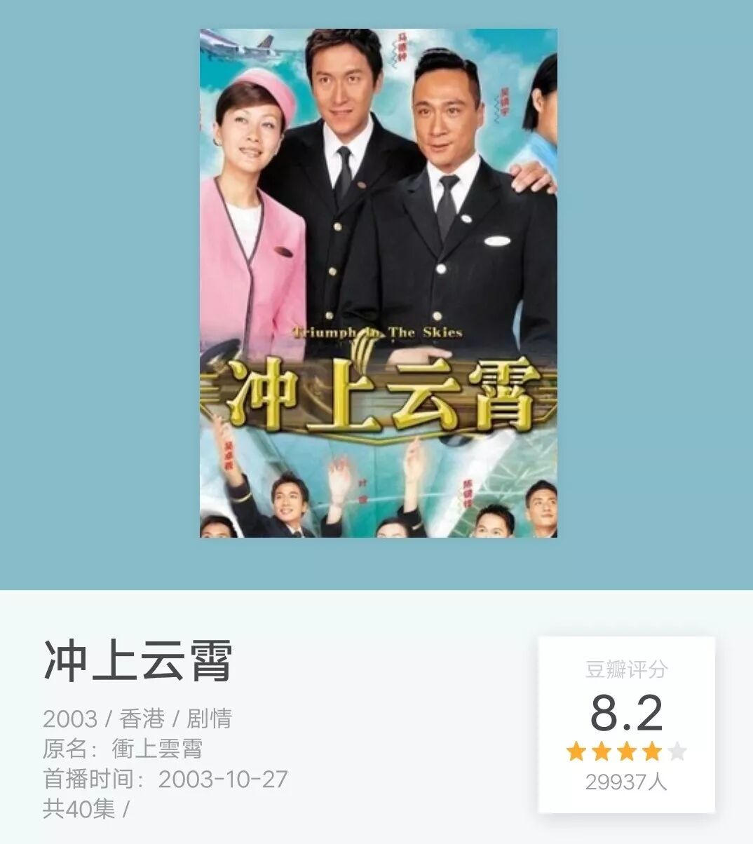 Source: pic.beforeout.com 《衝上雲霄》(英語: triumph in the skies )是香港 電視廣播有限公司製作的時裝航空電視劇,由吳鎮宇、陳慧珊、馬德鐘及胡杏兒領銜主演,由葉璇、吳卓羲、陳鍵鋒、黃宗澤、馬國明、胡定欣、石修、韓馬利、蘇玉華及林曉峰聯合演出,並由twins、王傑及陳奕迅.